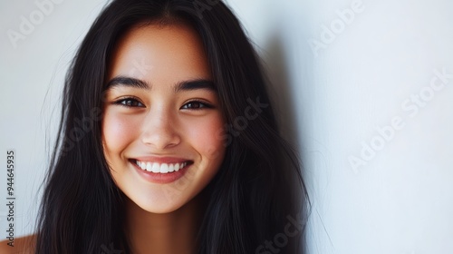 Beautiful woman with long black hair poses against a white wall backdrop, ideal for commercial use or banner ads. The clean background accentuates her striking features.