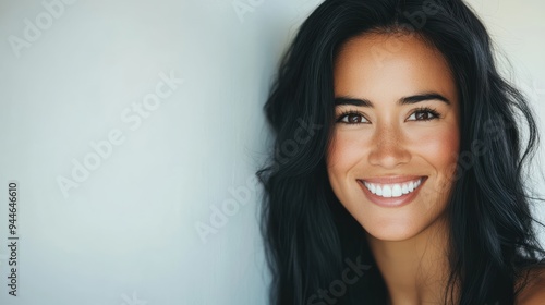 Beautiful woman with long black hair poses against a white wall backdrop, ideal for commercial use or banner ads. The clean background accentuates her striking features.