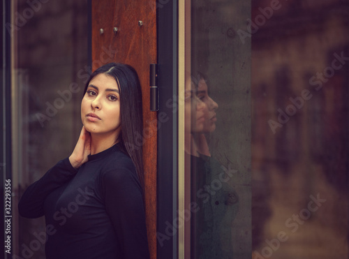 Beautiful woman with long black hair standing near the large windows and looking at the camera