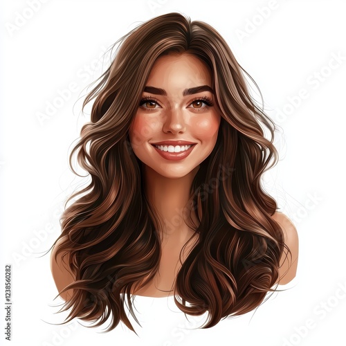 Beautiful woman with long wavy brown hair, radiant skin, and a confident smile, isolated on white background