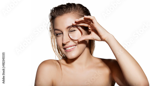 Beautiful woman with magnifying glass near eye mimic wrinkles on her face. Portrait isolated on white. Clean healthy skin and cosmetology concept. Image for cosmetology clinic advertising.