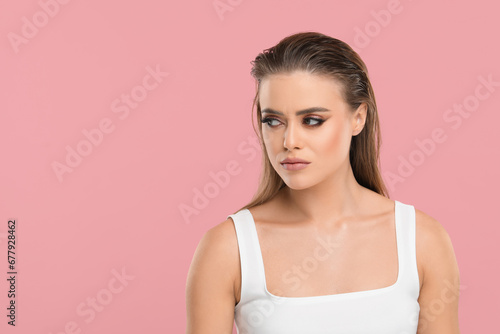 Beautiful woman with makeup on pink background, space for text