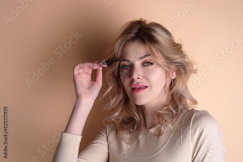 Beautiful woman with perfect shape eyebrows. Womans brows close up. Beautiful girl with eyebrow brush. Eyebrow correction. Long eyelashes and thick eyebrows.