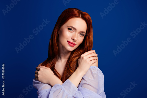 Beautiful woman with red hair and elegant makeup posing on blue background in a stylish and fashionable appearance