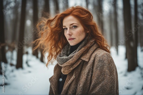Beautiful Woman with red hair in the winter forest with winter coat in the autumn forest. Winter Snowy Atmosphere. Generative AI