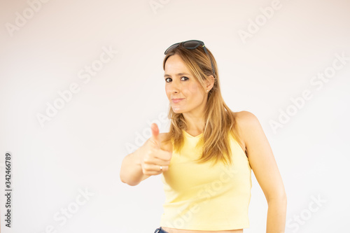 Beautiful woman with sun glasses over head with finger up