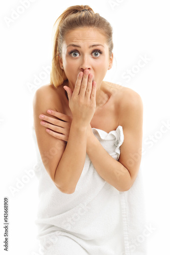 Beautiful woman with towel after bath isolated on white background