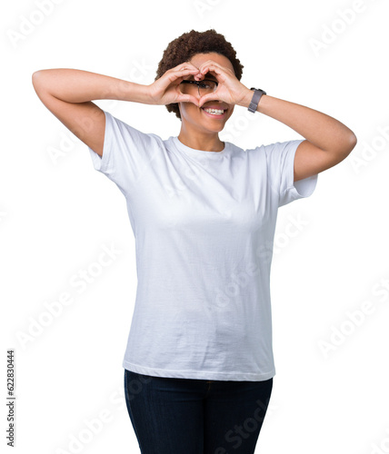 Beautiful young african american woman wearing glasses over isolated background Doing heart shape with hand and fingers smiling looking through sign