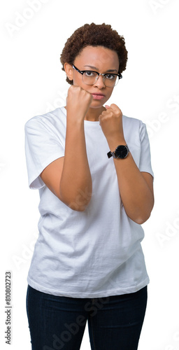 Beautiful young african american woman wearing glasses over isolated background Ready to fight with fist defense gesture, angry and upset face, afraid of problem