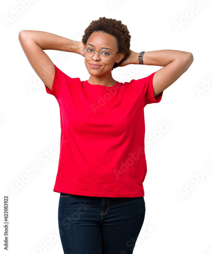 Beautiful young african american woman wearing glasses over isolated background Relaxing and stretching with arms and hands behind head and neck, smiling happy
