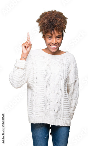 Beautiful young african american woman wearing winter sweater over isolated background showing and pointing up with finger number one while smiling confident and happy.