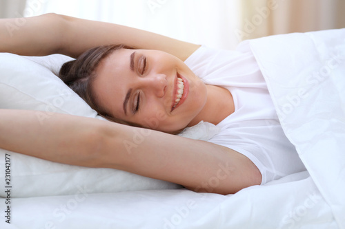 Beautiful young and happy woman stretching hands while lying in bed comfortably and blissfully smiling befor wake up in a morning. Sleeping concept