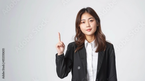 Beautiful young Asian business woman in casual suit pointing finger isolated on white background