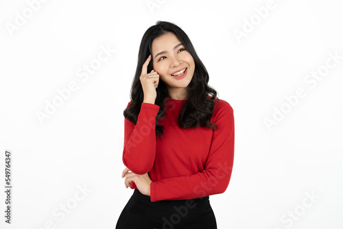 Beautiful young Asian girl thinking and looking upwards. The concept of content thinks about future isolated on white background.