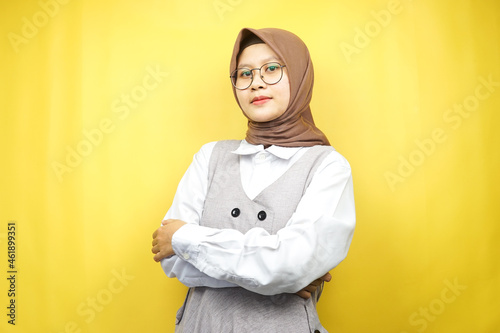 Beautiful young asian muslim woman smiling confidently with arms outstretched facing the camera isolated on yellow background
