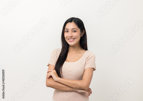 Beautiful young asian woman age around 25 smiling and happy. Charming female standing on isolated white background. Asian people pose looking camera with white backdrop.