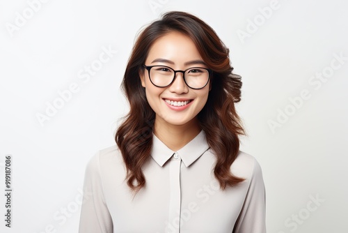 Beautiful young asian woman, company worker in glasses, smiling, standing over white background.