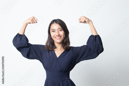 Beautiful young Asian woman flex bicep.