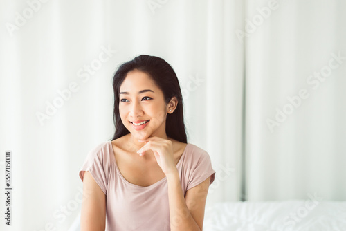 Beautiful young asian woman happy and smiling face while sitting at home