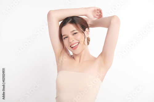 Beautiful Young Asian woman lifting hands up to show off clean and hygienic armpits or underarms on white background, Smooth armpit cleanliness and protection concept