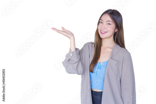 Beautiful young Asian woman long brown hair in a blue shirt is acting hand shows as presenting something isolated on white background.