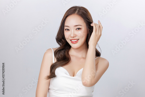Beautiful young Asian woman model long hair with natural makeup on face clean fresh skin on isolated background. Cute girl portrait, Facial treatment, Body care, Beauty and Spa.
