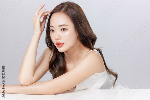 Beautiful young Asian woman model long hair with natural makeup on face clean fresh skin on isolated background. Cute girl portrait, Facial treatment, Body care, Beauty and Spa.