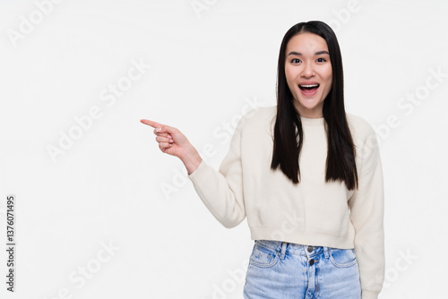 Beautiful young Asian woman pointing up to copy space and looking at camera with smile face and happy. Pretty girl act like a satisfied product, use for advertising with isolated on white background