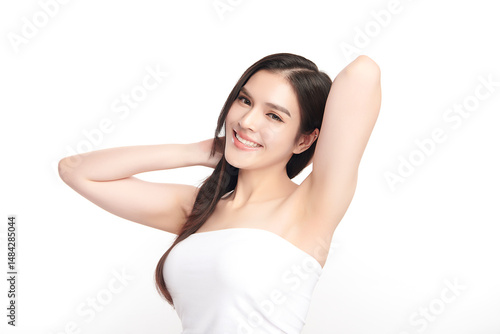 Beautiful Young Asian woman Raises her hands to Showcase clean and hygienic underarms Against a white background, Smooth armpit cleanliness and protection concept