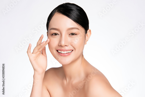 Beautiful Young asian Woman touching her clean face with fresh Healthy Skin, isolated on white background, Beauty Cosmetics and Facial treatment Concept