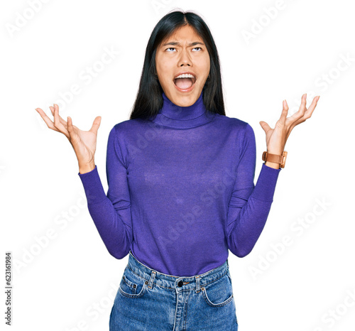 Beautiful young asian woman wearing casual clothes crazy and mad shouting and yelling with aggressive expression and arms raised. frustration concept.