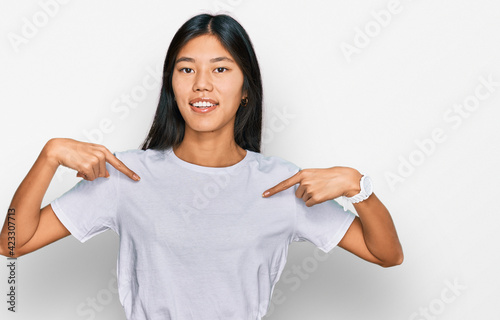 Beautiful young asian woman wearing casual white t shirt looking confident with smile on face, pointing oneself with fingers proud and happy.