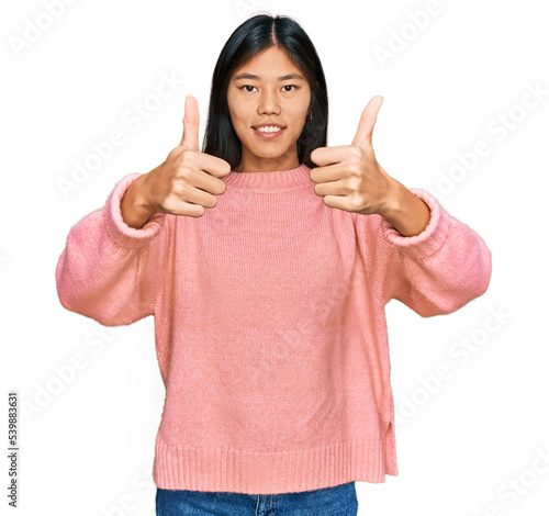 Beautiful young asian woman wearing casual winter sweater approving doing positive gesture with hand, thumbs up smiling and happy for success. winner gesture.