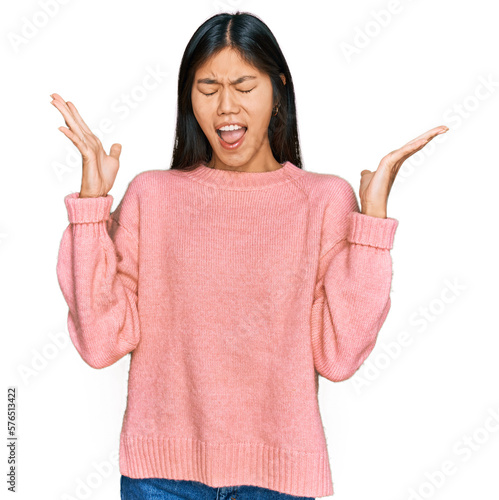 Beautiful young asian woman wearing casual winter sweater celebrating mad and crazy for success with arms raised and closed eyes screaming excited. winner concept