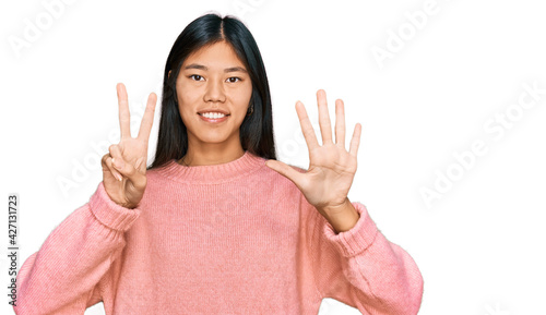Beautiful young asian woman wearing casual winter sweater showing and pointing up with fingers number seven while smiling confident and happy.