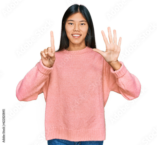 Beautiful young asian woman wearing casual winter sweater showing and pointing up with fingers number six while smiling confident and happy.