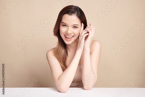 Beautiful young asian woman with clean fresh skin on beige background, Face care, Facial treatment, Cosmetology, beauty and spa, Asian women portrait.