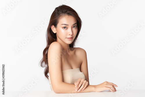 Beautiful Young asian Woman with Clean Fresh Skin, on Pink background, Face care, Facial treatment. Cosmetology, beauty and spa. Asian women portrait