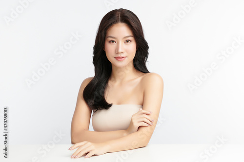 Beautiful young asian woman with clean fresh skin on white background, Face care, Facial treatment, Cosmetology, beauty and spa, Asian women portrait.