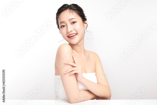 Beautiful young asian woman with clean fresh skin on white background, Face care, Facial treatment, Cosmetology, beauty and spa, Asian women portrait.