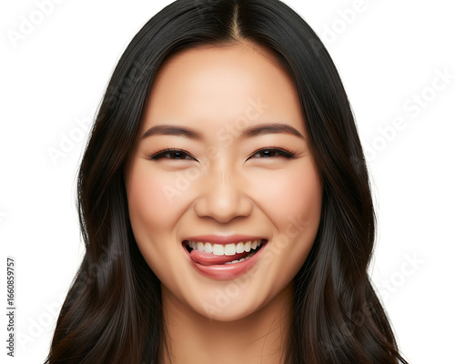 Beautiful young Asian woman with long dark hair smiling and licking her lips in a fun, happy expression isolated on a white background