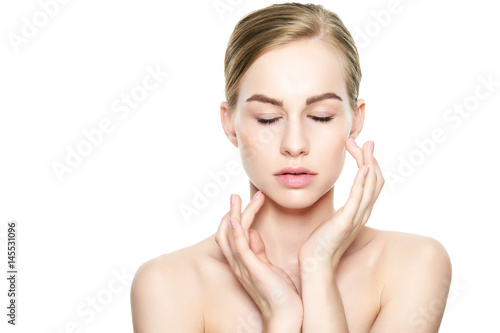 Beautiful Young Blond Woman with Perfect Skin touching her face. Facial treatment. Cosmetology, beauty and spa concept. Isolated on white background.