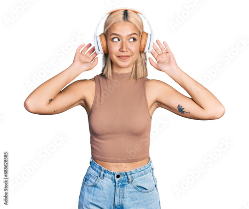 Beautiful young blonde woman listening to music using headphones smiling looking to the side and staring away thinking.