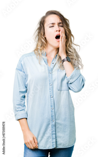 Beautiful young blonde woman over isolated background bored yawning tired covering mouth with hand. Restless and sleepiness.