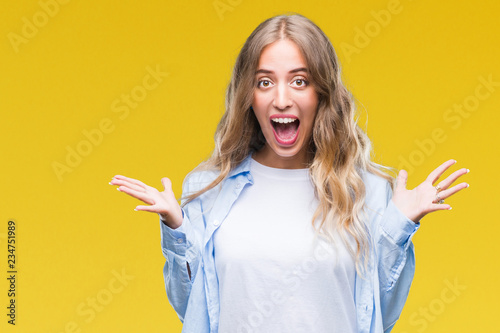 Beautiful young blonde woman over isolated background celebrating crazy and amazed for success with arms raised and open eyes screaming excited. Winner concept