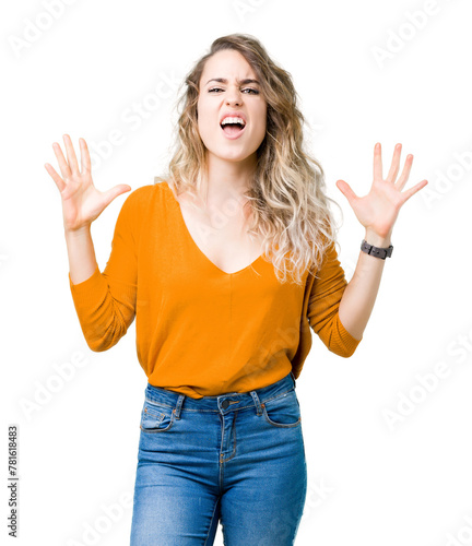 Beautiful young blonde woman over isolated background celebrating mad and crazy for success with arms raised and closed eyes screaming excited. Winner concept