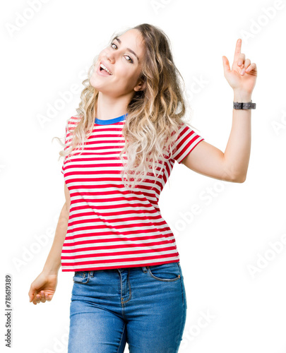 Beautiful young blonde woman over isolated background Dancing happy and cheerful, smiling moving casual and confident listening to music