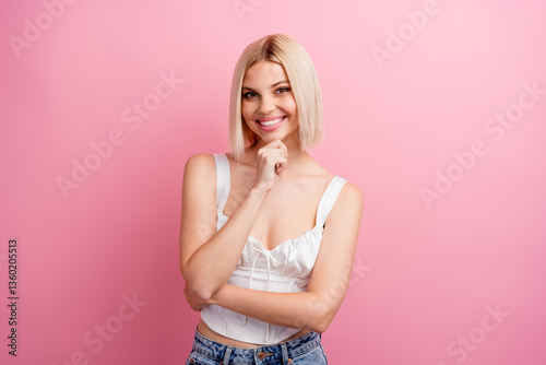 Beautiful young blonde woman posing with a charming smile against a pink background in casual white outfit