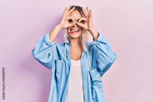 Beautiful young blonde woman wearing casual clothes and glasses doing ok gesture like binoculars sticking tongue out, eyes looking through fingers. crazy expression.