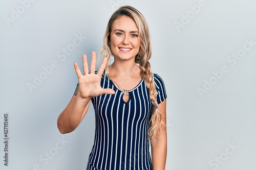 Beautiful young blonde woman wearing casual striped dress showing and pointing up with fingers number five while smiling confident and happy.